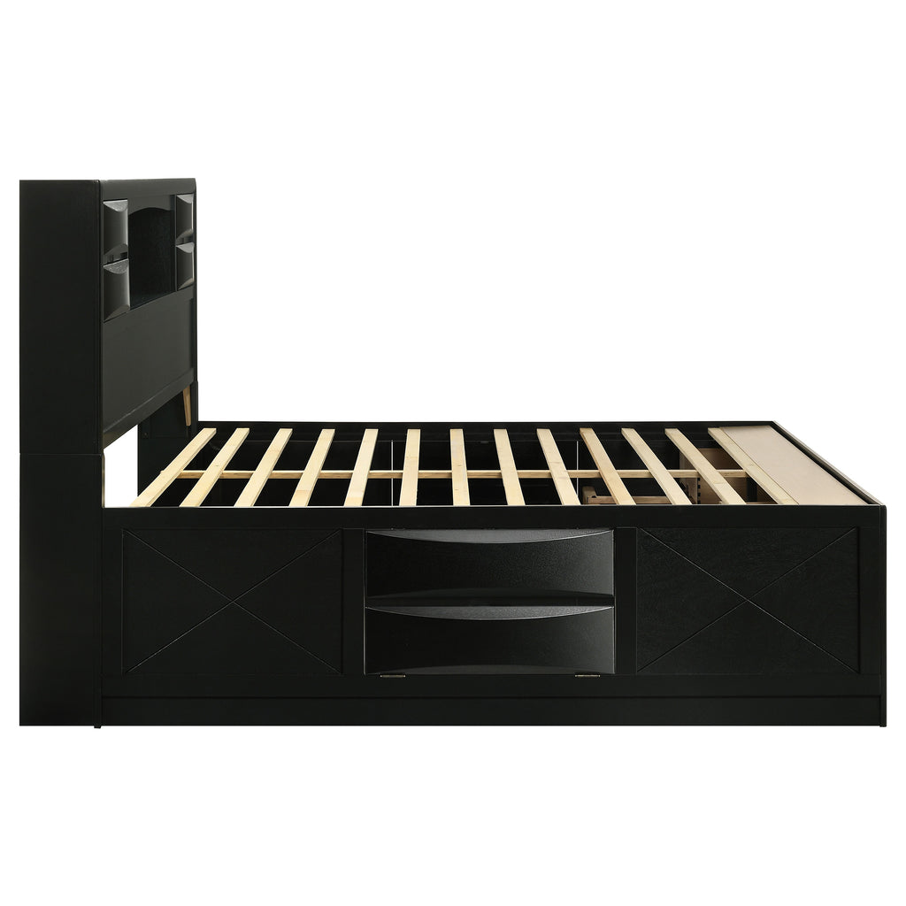 Elevate your bedroom with this modern bookcase storage platform bed finished in rich black. Thoughtfully designed for style and utility, it features four drawers in the headboard, four in the footboard, and convenient drop-down doors along the side rails for easy storage access. The bookcase headboard includes open shelving for books or décor, combining practicality with sleek design. Crafted from rubberwood, engineered wood, and okume veneer, this platform bed delivers lasting quality and eliminates the need for a foundation._x005F_x000D_ Key Features: • Queen bookcase storage platform bed with sleek transitional design • Four headboard drawers and open shelves for easy access storage • Footboard includes four drawers for linens and seasonal items • Side rails feature drop-down doors for concealed storage access • Rubberwood and engineered veneer construction ensures durability • Platform design supports mattress without box spring foundation