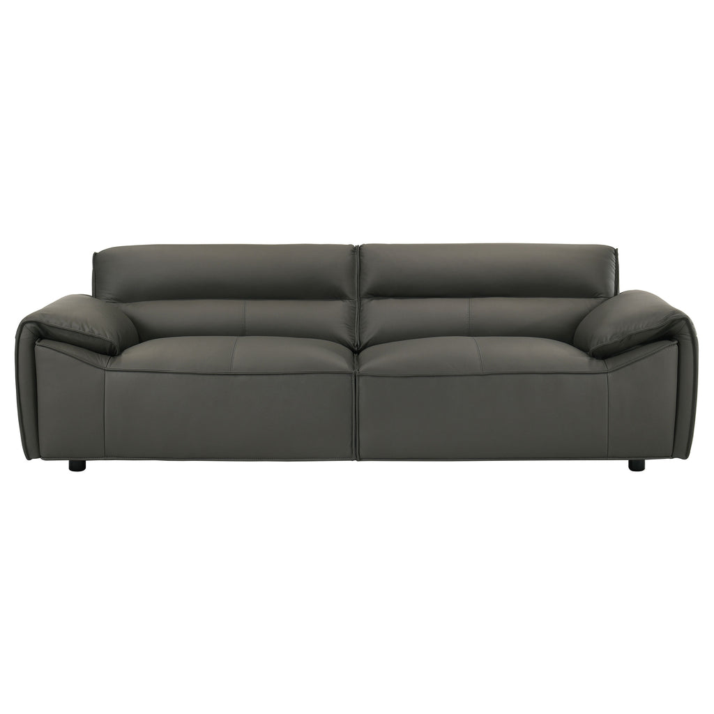 Sleek and sculptural, this leather-upholstered sofa blends minimalist form with elevated comfort. Wrapped in 100% genuine top grain leather, it offers a luxurious hand and timeless presence. Wide track arms and a low-profile frame shape a bold, architectural silhouette, while deep seating and padded back cushions provide an inviting place to unwind. Built with sinuous spring support and high-density full foam seating, it delivers lasting comfort wrapped in tailored sophistication. Key Features: • Sofa upholstered in 100% top grain leather for premium texture, durability, and refined comfort • Orange tone adds rich depth and modern character to any living space • Low-profile frame with wide track arms offers sculptural appeal and relaxed style • Deep seat cushions and padded backrests provide supportive lounging • High-density full foam seating ensures consistent comfort and lasting shape retention • Sinuous spring foundation delivers flexible support and balanced weight distribution