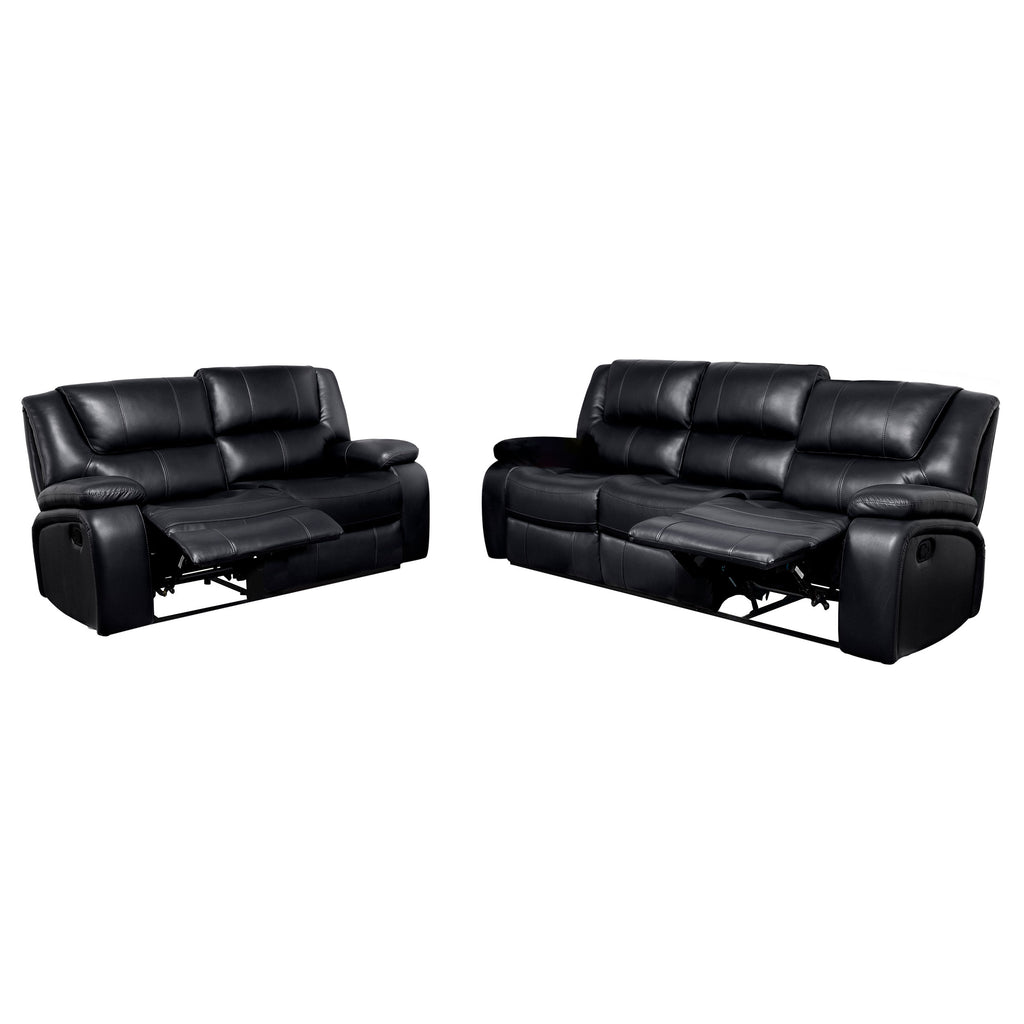 Deep red faux leather captures attention immediately in this reclining living room seating set. Plush foam cushions and pillowtop arms ensure exceptional comfort, while covered leg rests create the perfect relaxed ambiance. Vertical stitching accents add a hint of texture and dimension while contour tufting creates targeted support for movie nights and Sunday game days. Seats feature webbing support with sinuous springs that create wonderful comfort and relaxation. The stylish, rich color of the set adds refined character in your living room, offering versatility for everything from entertaining to relaxing with the kids. Key Features: • 2-piece reclining sofa set in rich deep red faux leather upholstery for a captivating look • Plush foam cushions and pillowtop arms for exceptional comfort • Contour tufting and vertical stitching accents for added texture and dimension • Webbing support with sinuous springs for wonderful comfort and relaxation • Stylish color adds refined character to your living room