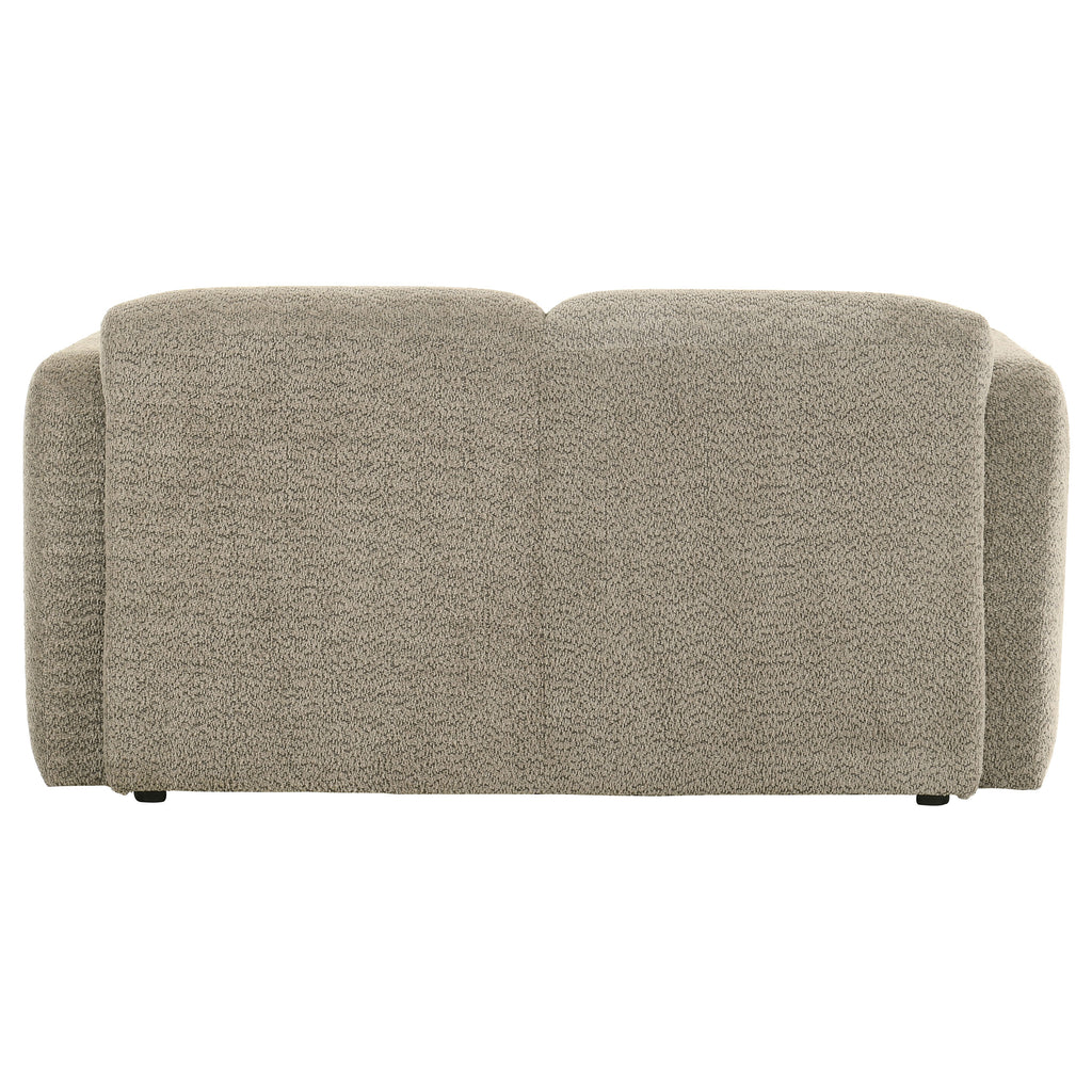 This sculpted loveseat brings bold softness and inviting texture to modern spaces. Its low-profile frame is wrapped in richly textured fabric with a cozy, tactile feel. Rounded track arms and a smooth, contoured silhouette create a cocoon of comfort. High-quality foam and pocket coil seating ensure long-lasting support without sacrificing softness. With a clean, minimal form, this two-seat loveseat adds warmth and refined presence to any living room or lounge. Key Features: • Two-seat loveseat with low-profile, sculptural silhouette and soft, rounded edges • Textured white fabric upholstery offers warm tone and inviting hand feel • Curved track arms and contoured frame provide supportive modern style • High-quality foam padding adds plush comfort to every seating zone • Pocket coil seating delivers durable support and shape retention • Perfect for compact living spaces seeking soft form and relaxed design