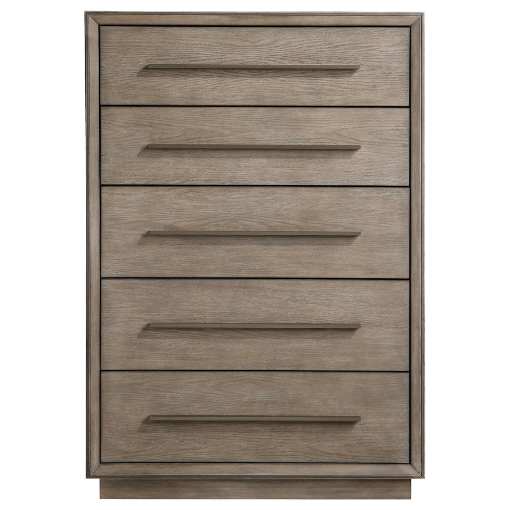 With five spacious drawers, this chest is convenient and versatile. Its large size is ideal for keeping your wardrobe organized. Its strong silhouette is enhanced by an attractive, smoked peppercorn finish. Its long, sleek drawer handles and outer frame are a lovely shade of gold, giving it an eye-catching touch of glamour. With a transitional design, this chest blends seamlessly with a variety of decor styles. Key Features: • Large, five-drawer chest ideal for wardrobe organization • Features a strong silhouette enhanced by a smoked peppercorn finish • Accented with long, sleek gold drawer handles and outer frame for a touch of glamour • Boasts a transitional design that blends seamlessly with various decor styles • Offers convenience and versatility with its spacious storage capacity