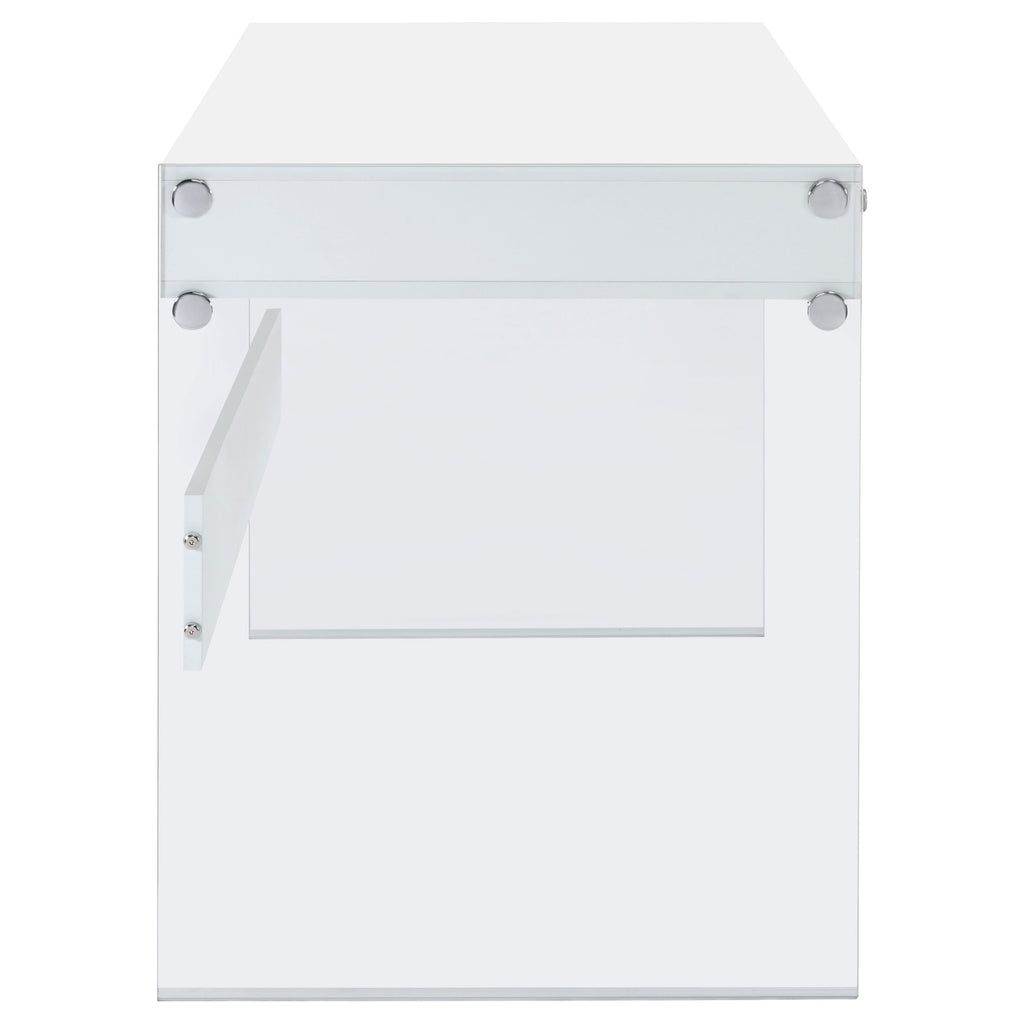 With its cool, contemporary appeal, this versatile writing desk works well in a bedroom or living room. It creates a functional space to work and study without sacrificing style. Bold, thick, tempered glass panels form its base supports, giving it an inspired touch of glamour. Its striking aesthetic is brought to life with a finish of glossy white. This desk is complete with an open center compartment and two drawers, adding extra convenience while maintaining its sleek look. Key Features: • Contemporary writing desk with clear glass side panels and white top • Two drawers and one center cubby provide storage and function • High gloss engineered wood top adds a polished modern appearance • Tempered glass legs give the desk a floating visual effect • Sleek chrome-finished knobs complement the clean white design • Ideal for minimalist bedrooms, living rooms, or compact offices