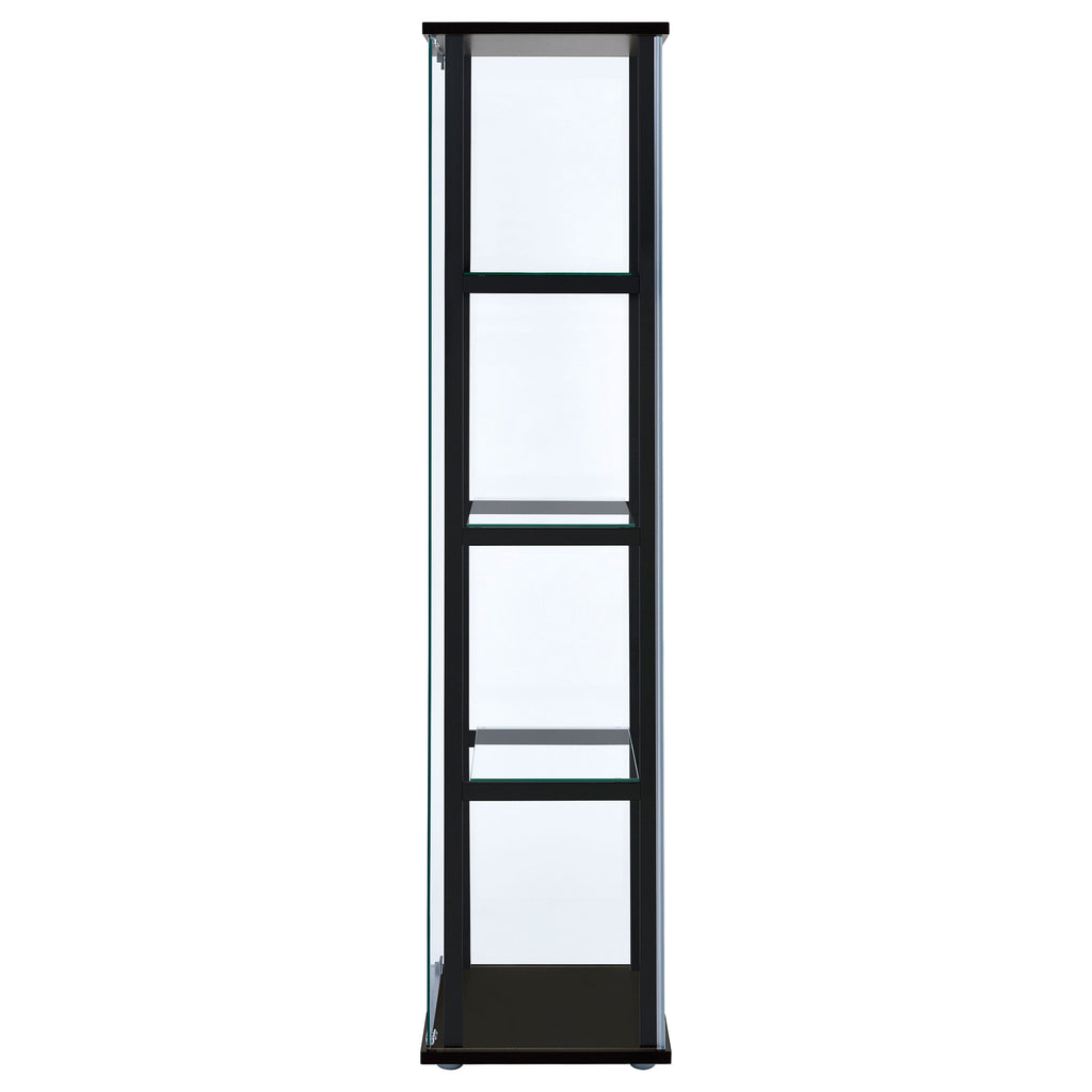 A modern version of a true classic makes a fabulous addition to a transitional space. With linear styling and a fresh look, this curio cabinet offers a perfect venue for showcasing treasured decor. Bold black tops a simple frame, top, and base. Tempered glass shelves create transparent space for display. Access its interior easily with push-to-open doors. Key Features: • Modern curio cabinet in black finish • One reversible magnetic push-to-open clear tempered glass door provides ease of access and strength • Three tiers of shelving for additional display space • Available in a variety of sizes • Glass, pine, particle board, and laminate construction