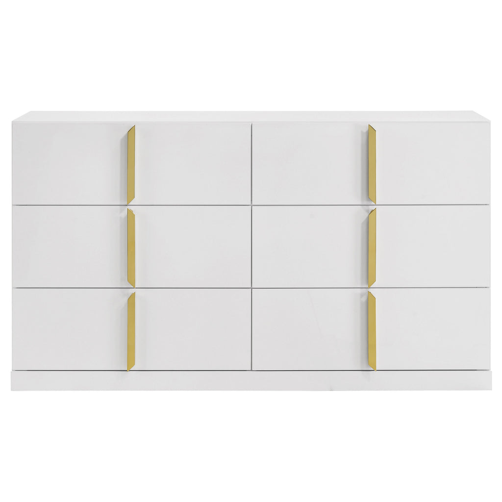 Clean and structured, this six-drawer dresser draws from Italian contemporary style to deliver bold presence and refined function. Finished in white high gloss PET thermoplastic, it offers a scratch-resistant, moisture-resistant surface that is both durable and eco-friendly. Vertically mounted polished gold pulls create a sculptural centerline across six smooth-gliding drawers, combining sleek storage with standout design. Key Features: • Six-drawer dresser with bold vertical symmetry and sculptural gold-accented design • Eco-friendly PET thermoplastic finish is durable, scratch-resistant, and easy to clean • Moisture- and heat-resistant PET surface helps prevent warping and fading over time • Polished gold handles offer sleek contrast and vertically mounted visual structure • Drawers feature English dovetail joinery and smooth operating metal glides • Crafted from engineered wood and includes a tip-over restraint for added safety