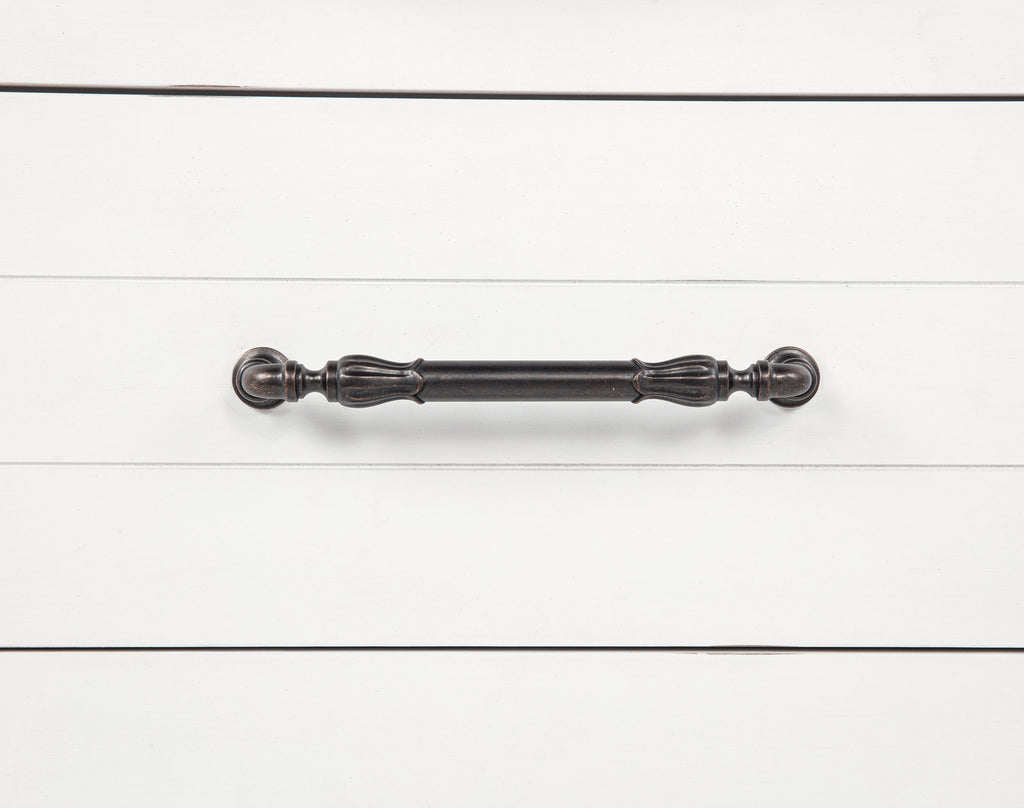 Timeless in spirit and refined in detail, this five-drawer chest evokes quiet charm and lasting beauty. A vintage white finish softens its stately frame, while molded edges and antique bronze ring pulls add character and depth. Designed with thoughtful craftsmanship, it offers spacious storage and smooth functionality. Built from poplar, engineered wood, and veneer, it brings elegance and purpose to the bedroom. Key Features: • Five-drawer chest with classic molding and clean lines for graceful bedroom storage • Vintage white finish offers a soft, aged look with traditional character • Antique bronze ring pulls add warmth and contrast to the light wood tone • Spacious drawers glide smoothly and are crafted with thoughtful construction • Top drawer is felt lined to protect delicate accessories and essentials • Built from poplar, engineered wood, and veneer for enduring style and strength
