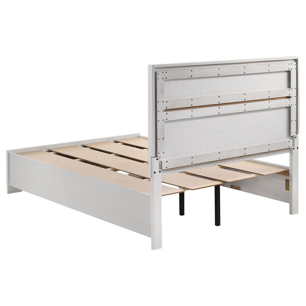 Sparkling diamond-like trim ups the glamour for a five-piece modern bedroom set. Compelling in its elegant simplicity, it centers on an upholstered bed and features a lightly textured white finish paired with smooth white molded trim. A nightstand, dresser with mirror, and chest provide plenty of drawers for easy storage and organization. Stripes of glittering, diamond-like trim and jewel-like bar pulls elevate the set, creating a fresh, sophisticated look and feel for your bedroom. Bracket feet complete the look with a touch of movement.