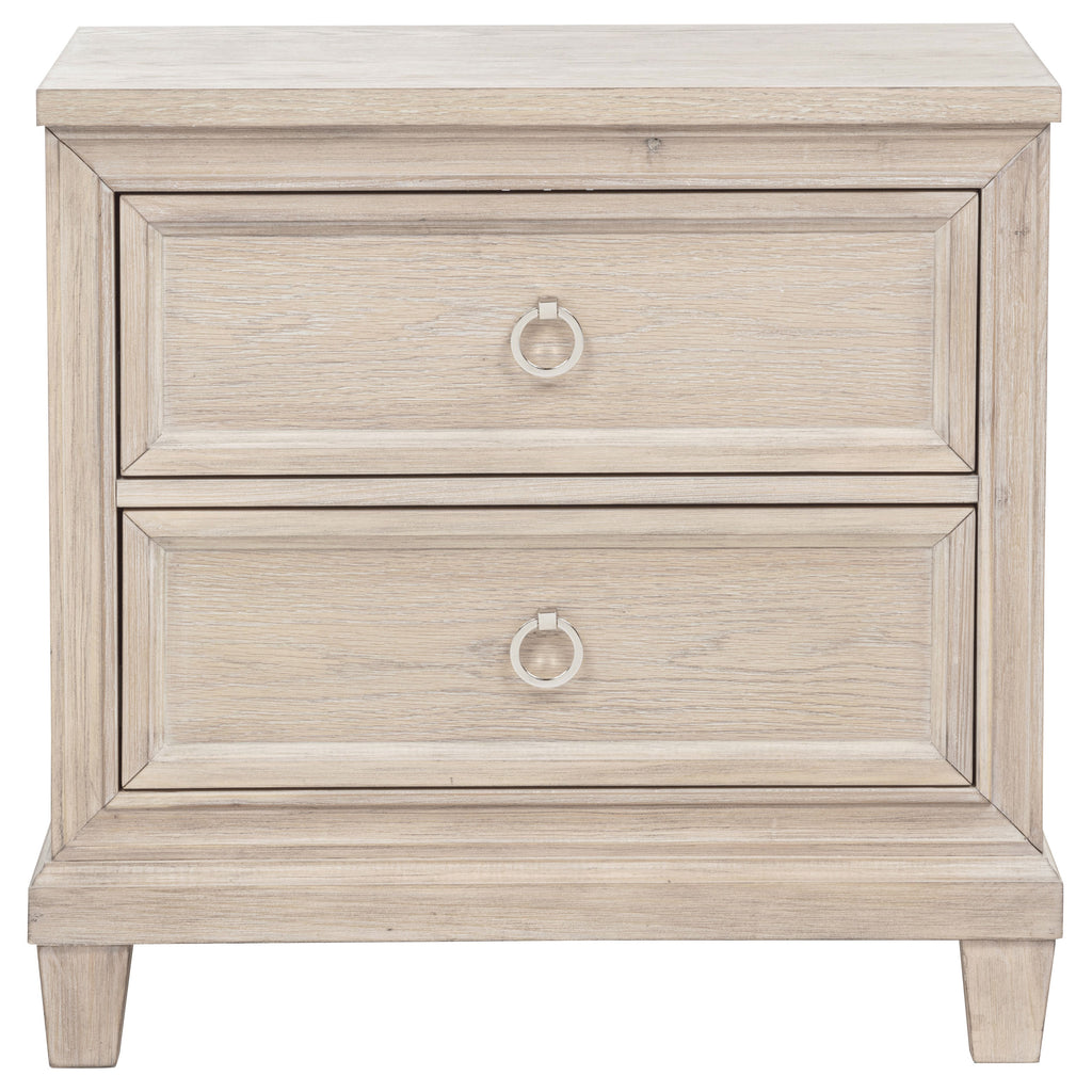 Effortlessly elegant and thoughtfully designed, this two-drawer nightstand brings refined charm to the bedside. Framed with stepped trim and finished in breezy washed oak, it offers a light, coastal-inspired presence. Polished nickel ring pulls add a glint of elegance, while built-in cable access discreetly manages devices tucked inside the upper drawer. Crafted from poplar, oak veneer, and engineered wood, it marries timeless style with everyday convenience. Key Features: • Two-drawer nightstand with stepped trim and clean lines for soft, classic structure • Washed oak finish brings coastal-inspired warmth and visible wood grain • Upper drawer includes cable access for discreet charging and device storage • Polished nickel ring pulls add a refined touch to the timeless silhouette • Crafted from poplar, engineered wood, and oak veneer for everyday durability • Perfect as a bedside table with a blend of tradition, beauty, and hidden utility
