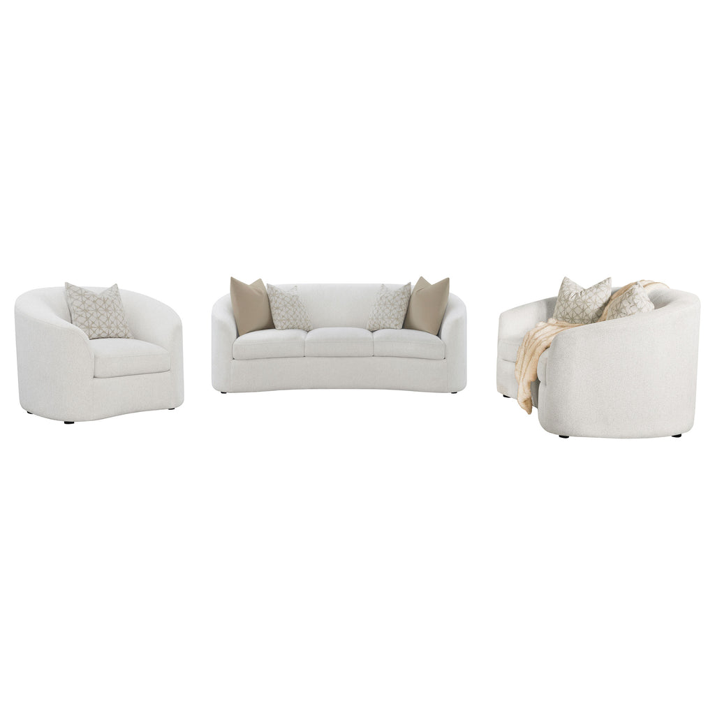 Create your modern entertaining area with this mid-century modern-inspired contemporary seating set, upholstered in a neutral latte finished boucle fabric across its elegant and curvy silhouette. Curved and sloped armrests and plush cushions keep family and visitors comfortable all through the gathering. Coordinating boucle accent pillows with premium faux down fill provide extra comfort as discreet black legs offer a bit of elevation and definition over decorative rugs.
